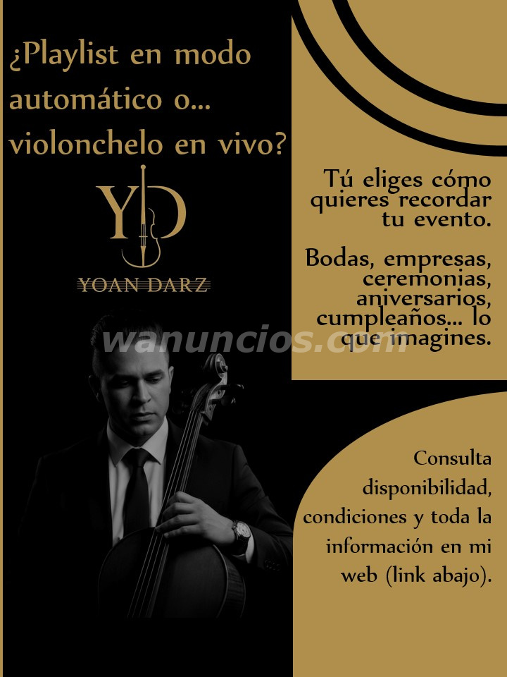 Violonchelista profesional con amplia experiencia en eventos de todo tipo: bodas, ceremonias, cócteles, aniversarios y celebraciones. Ofrezco música en vivo de calidad, repertorio adaptable (clásico, moderno, bandas sonoras, pop, etc.) Equipo propio y seriedad. Consulta sin compromiso en mi sitio web para Bilbao y alrededores:https//sites.google.com/view/yoandarz/inicio
